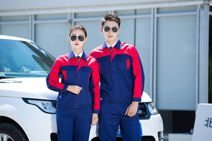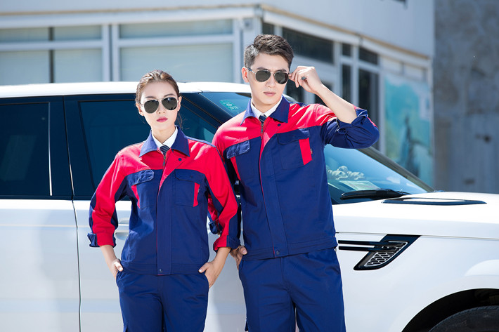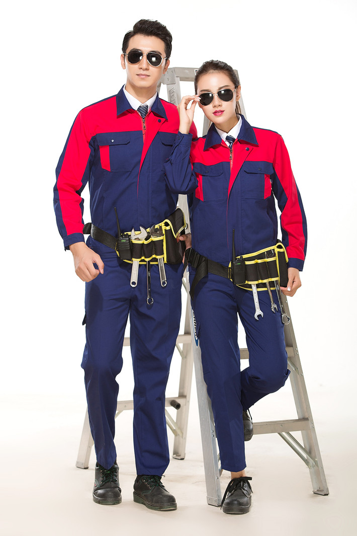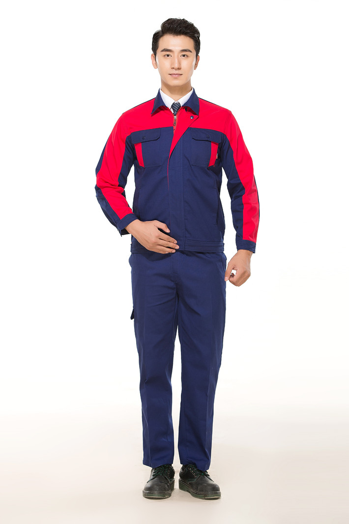 鳳臺縣工作服定做廠家定制工服款式全棉藏青色拼紅色套裝GZ-8019