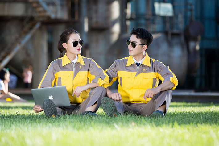 全棉紗卡黃色拼灰色拉鏈式工作服長袖套裝GZ-QM8018